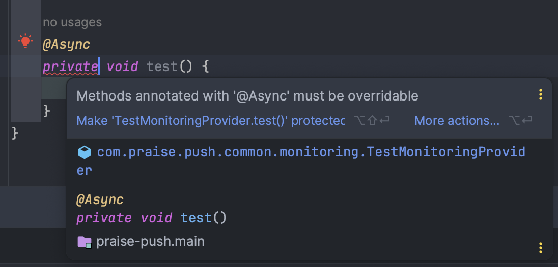 1번은 private 메서드에 @Async를 붙여보면 IntelliJ에서 컴파일 에러를 확인해 볼 수 있습니다.