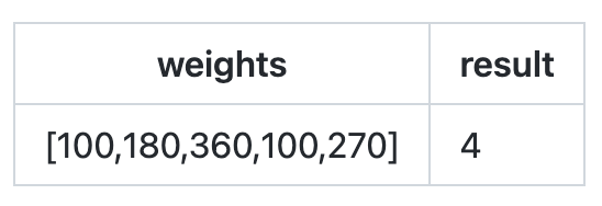 - weights가 [100, 100, 180, 270, 360] 일 때를 생각해보자. (정렬 후의 상태)