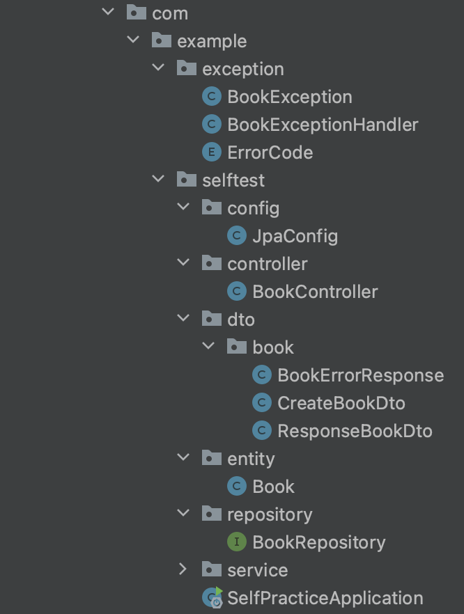 눈치채셨을까요. 제 프로젝트의 시작할 때 초기 구조는 com.example.selftest 였습니다. selftest 패키지 내부에 service, entity, repositroy, controller 등의 패키지가 존재합니다.