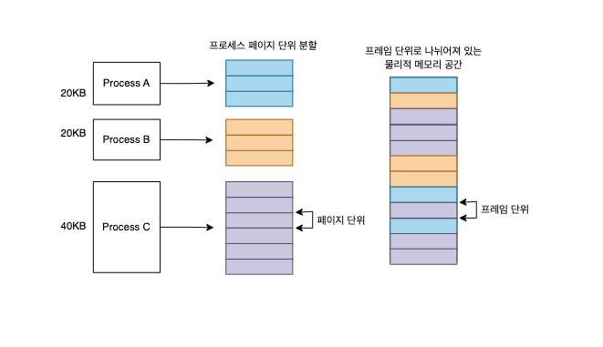 - 프로세스에게 연속적인 메모리를 할당하지 않고, 메모리를 페이지 단위로 나누어 서로 다른 위치에 프로세스를 할당합니다.