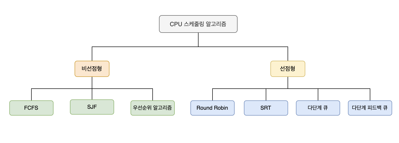 - CPU 스케줄링 알고리즘은 크게 비선점형과 선점형으로 나눌 수 있습니다.