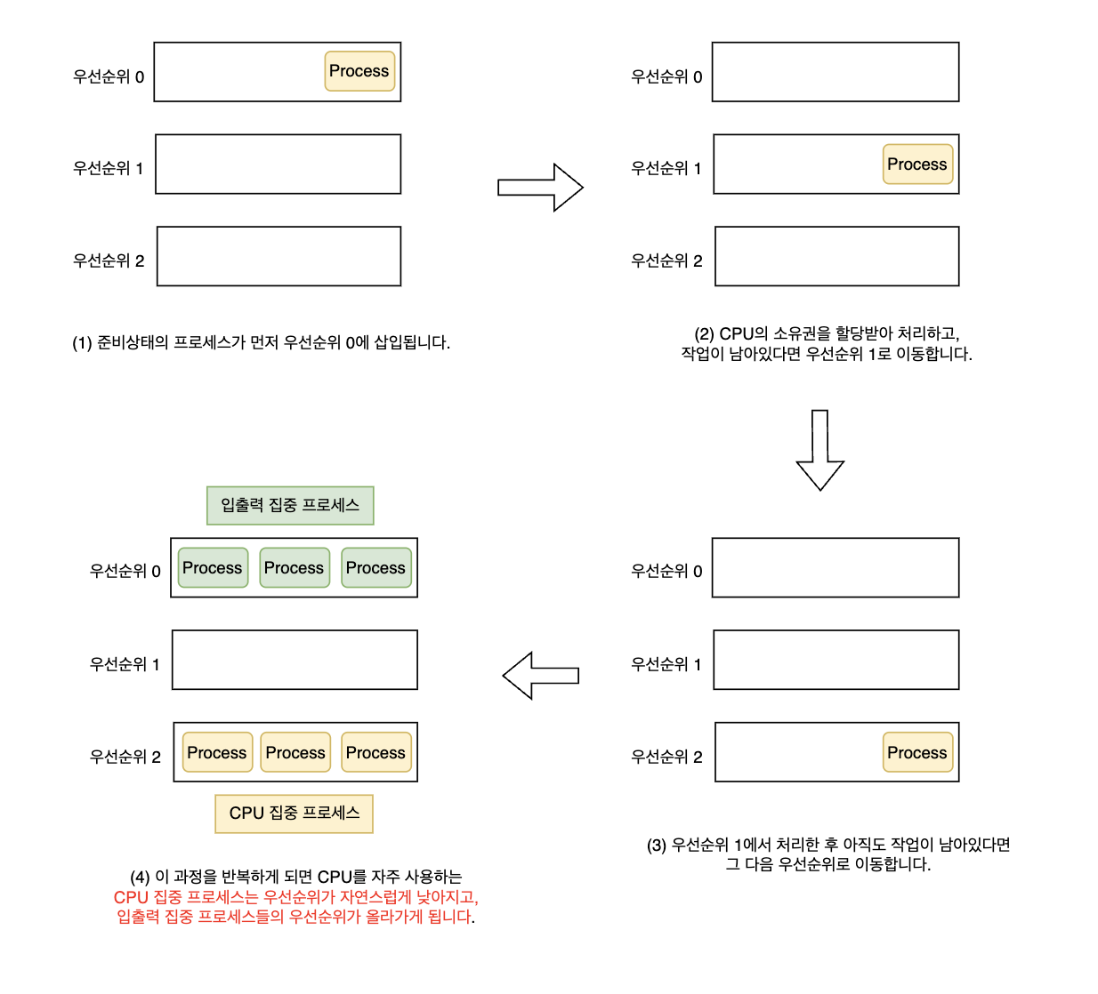 (4) 다단계 피드백 큐 스케줄링 (Multilevel Feedback Queue 스케줄링)
