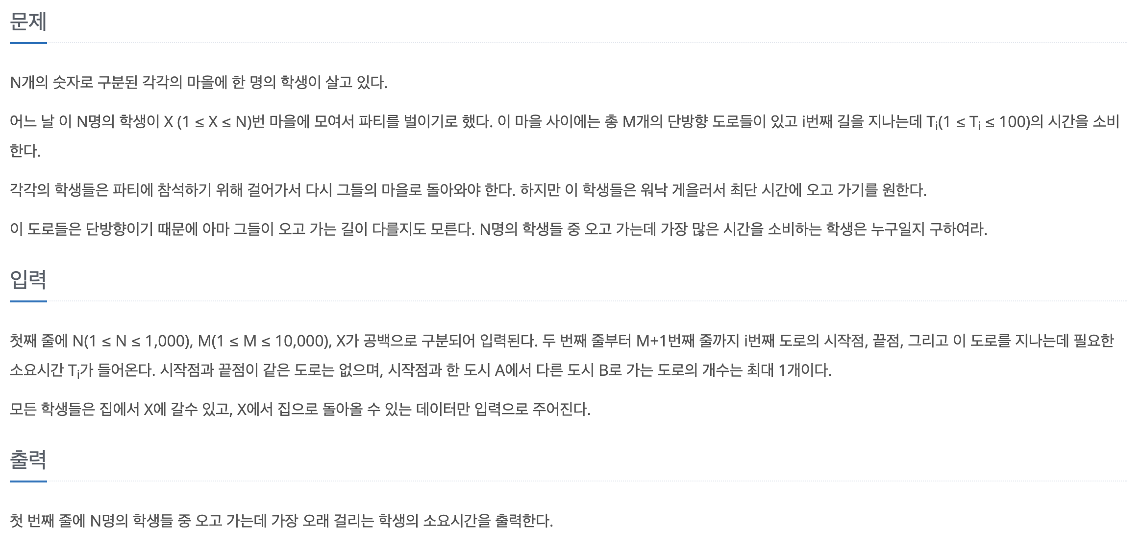 - N명의 학생들은 X번 마을까지 갔다가 다시 돌아와야 한다.